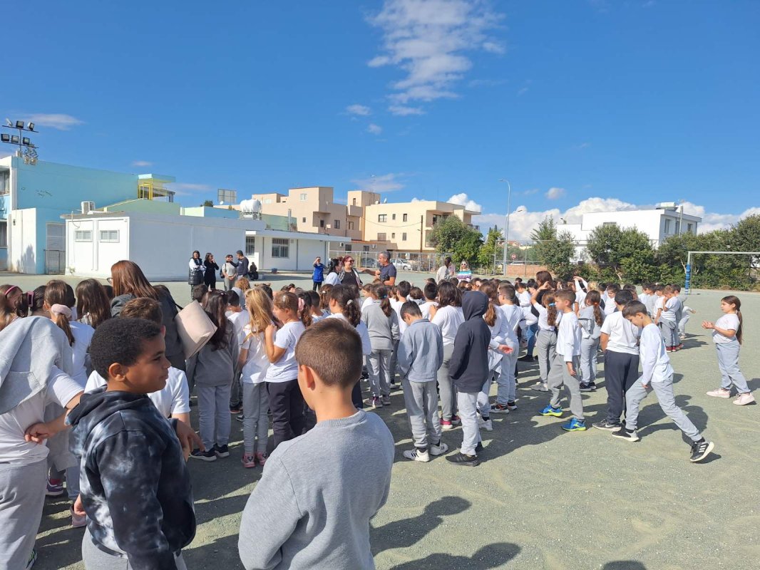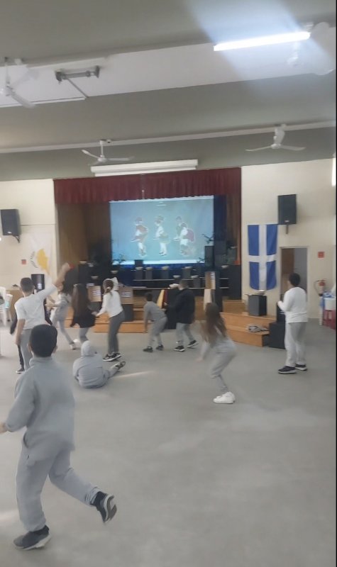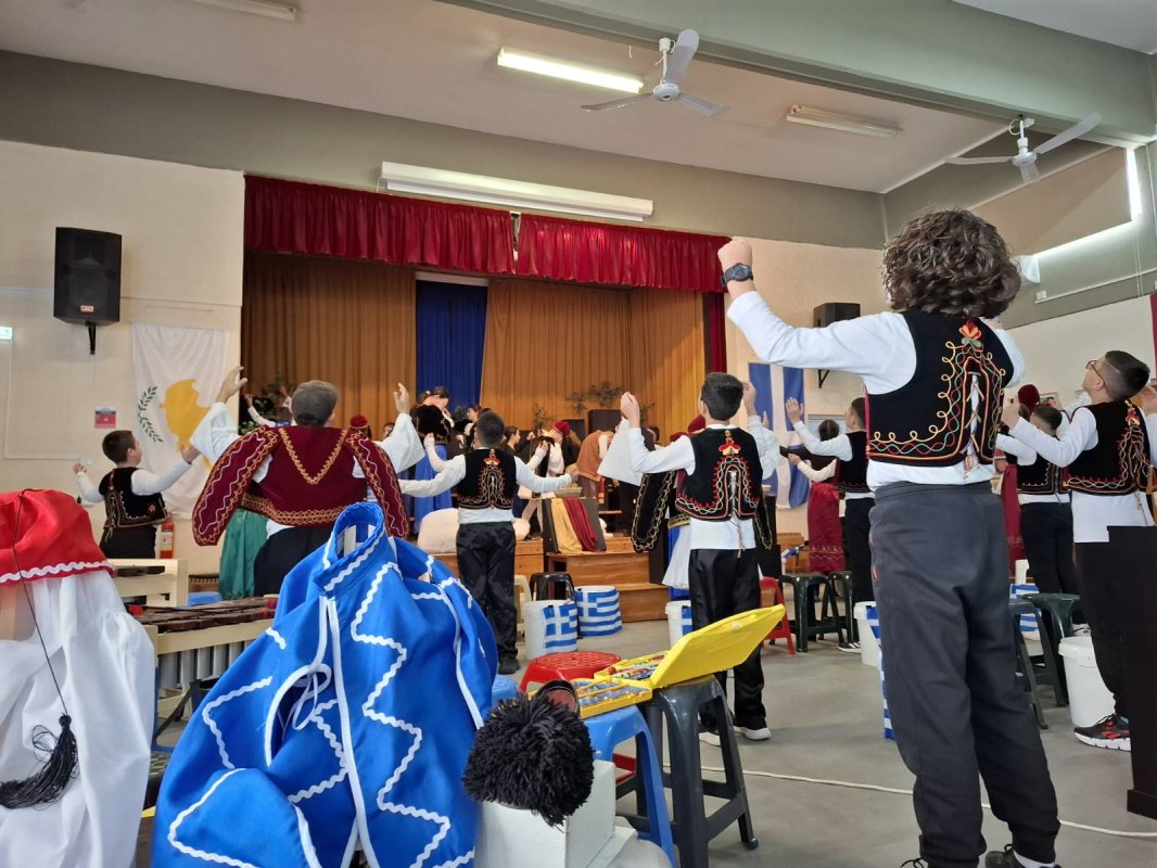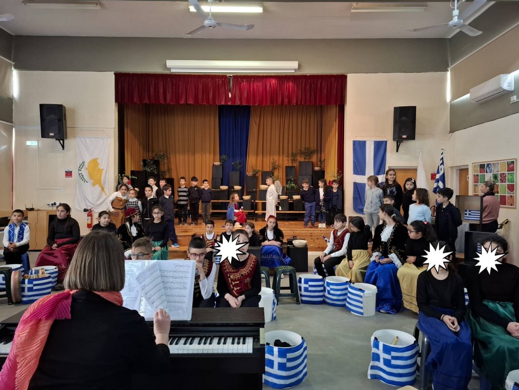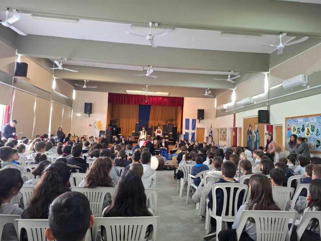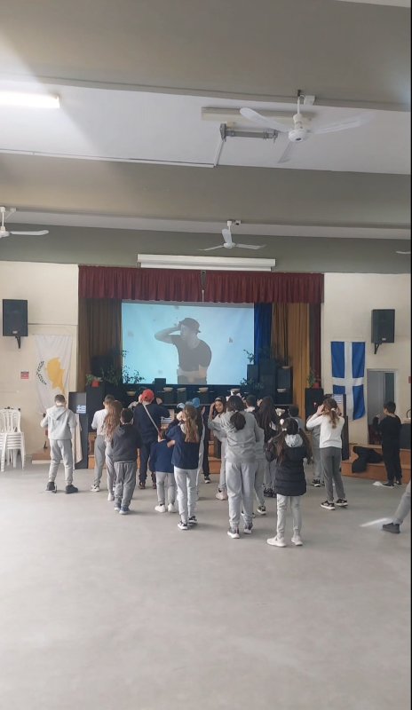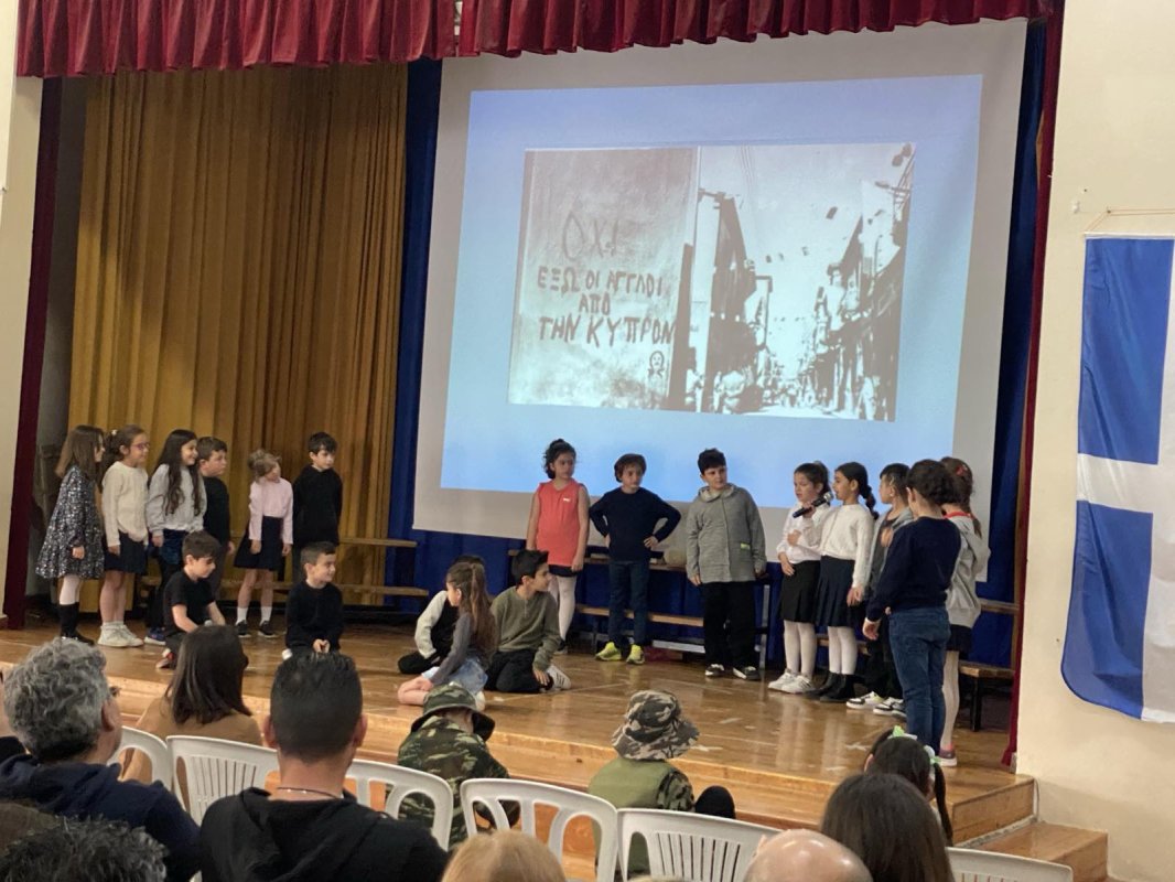 Η Δ' 2 με τον δάσκαλό της, κ. Παύλο Χοπλαρο, παρουσίασαν μια αναδρομή της ιστορίας της Κύπρου στην ολομέλεια του σχολείου.