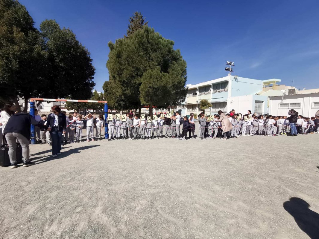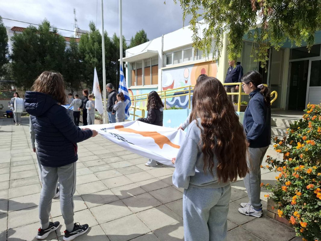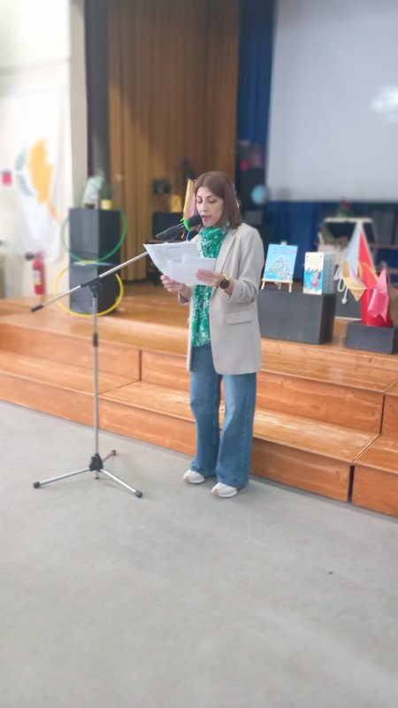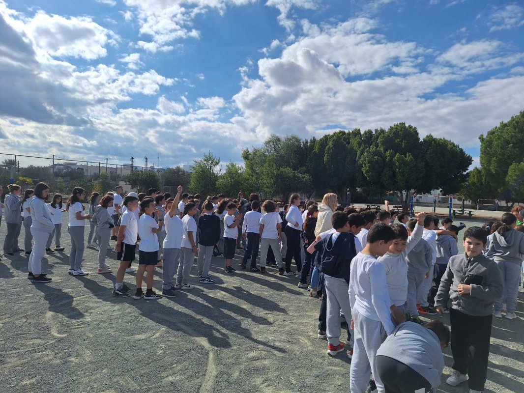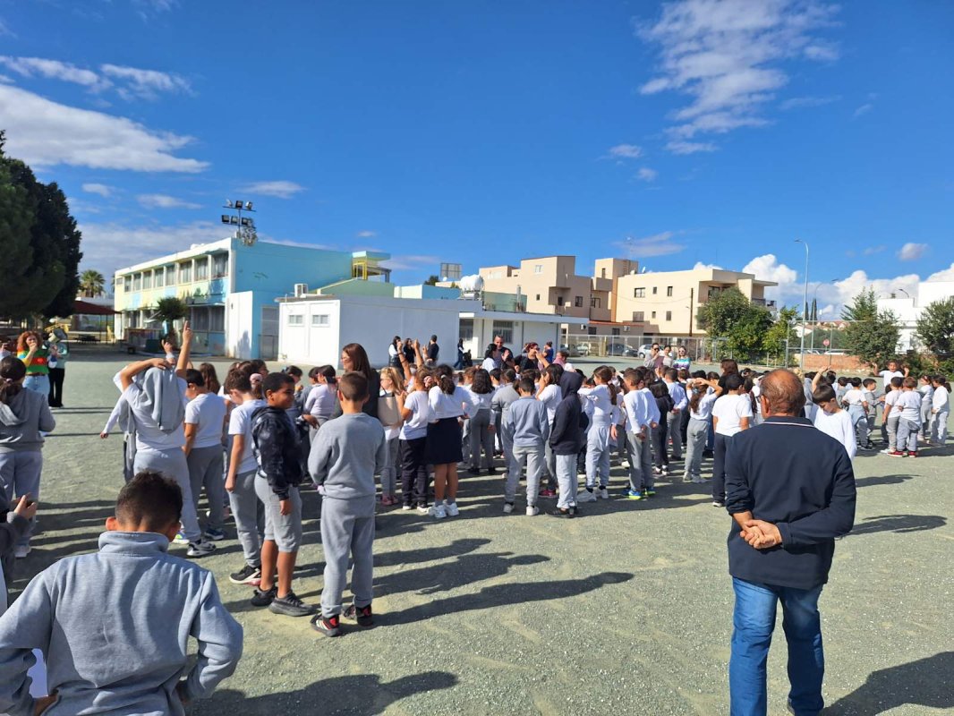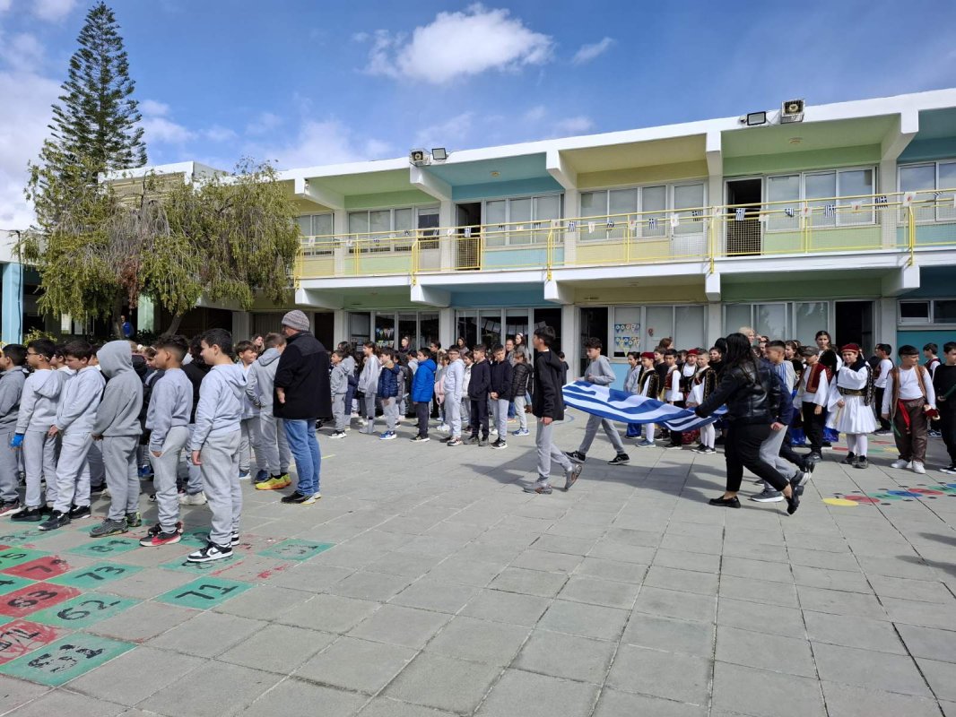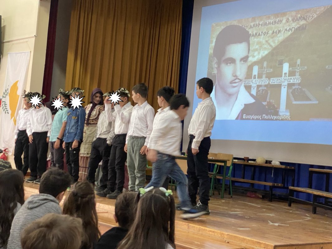 Η Δ' 2 με τον δάσκαλό της, κ. Παύλο Χοπλαρο, παρουσίασαν μια αναδρομή της ιστορίας της Κύπρου στην ολομέλεια του σχολείου.